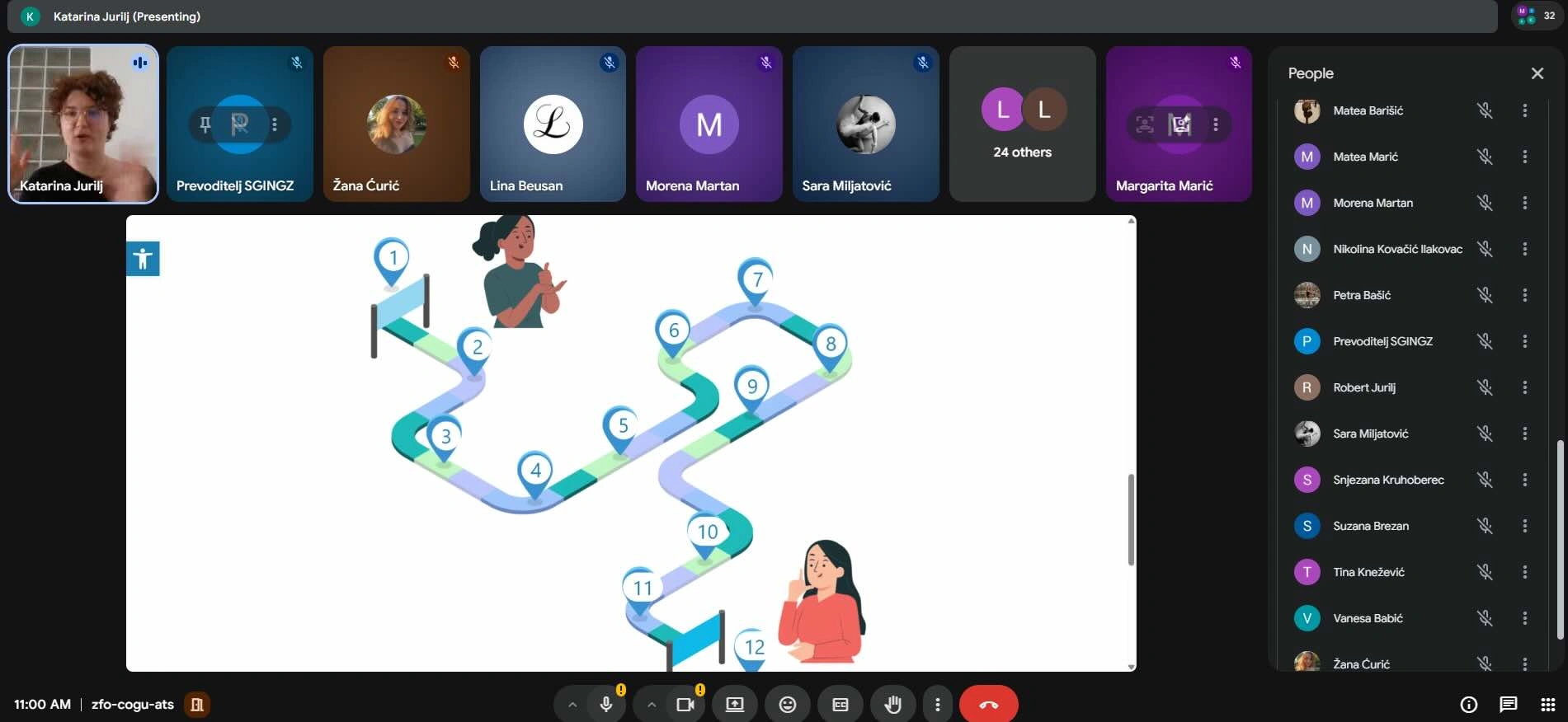 The testing session was conducted online, ensuring a highly accessible and inclusive learning environment. Communication was supported through multiple channels, including Croatian Sign Language interpretation, spoken language, and real-time transcription. Two sign language interpreters were present throughout the session, ensuring smooth and effective communication for all participants.